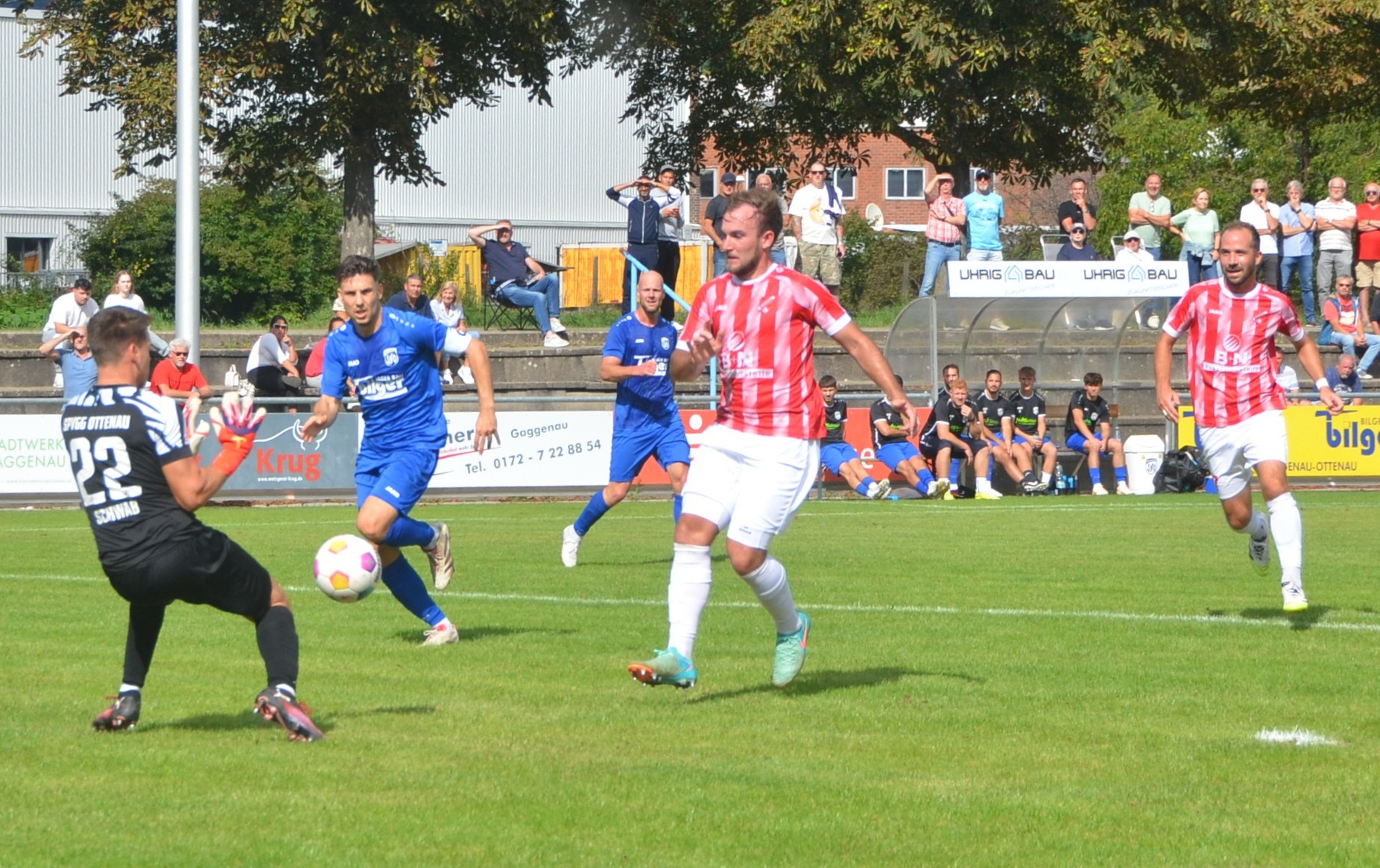 Die Kinzigtäler beeindruckten durch eine starke Mannschaftsleistung gegen einen guten Gegner im Murgtal, in der die Abwehr mit Maik Wichmann, Lukas Nitzsche, Elias Esslinger und Leon Brosamer überragend spielte und kaum Chancen der Gastgeber zuließ. Trotzdem gab es für den Sportclub nach nicht mal einer Minute eine Schrecksekunde, als Maik Wichmann einen Schuss von Felice Montechiaro für seinen geschlagenen Keeper Daniel Lupfer auf der Linie rettete. Die Elf von Spielertrainer Alexander Merkel versuchte durch frühes Pressing die Gäste in ihrem Spielfluss zu hemmen, was 15 Minuten lang gut funktionierte. So gehörte auch die zweite Möglichkeit den Gastgebern in der 6. Minute. Noah Karcher traf aber das Leder nicht voll. Allmählich befreite sich Hofstetten vom Druck der Gastgeber und übernahm – angeführt von Luca Kehl, Jonas Kinast und Jannik Schwörer die Spielkontrolle. Einen ersten Warnschuss für Ottenau gab es dann in der 15. Minute durch Marc Hengstler. Nach 20 Minuten war SpVgg.-Keeper Pascal Schwab gefordert, als er einen Schuss von Marco Petereit meisterte. Nach Balleroberung in der gegnerischen Hälfte wurde Luca Kehl in der 26. Minute bedient, der Keeper Lang im Duell eins gegen eins ein zweites Mal zu einer Glanztat zwang. Dieses Mal wurde der Abpraller verwertet, denn das Leder kam genau vor die Füße von Marco Petereit – 0:1. Jetzt lief der Ball gekonnt durch die Reihen der Kinzigtäler, die das Spiel an sich rissen. Lediglich einmal noch musste SC-Keeper Daniel Lupfer gegen Felice Montechiaro auf der Hut sein. In der 42. Minute schien das 0:2 nur noch Formsache zu sein. Nach einem schönen SC-Spielzug legte Marc Hengstler auf Jannik Schwörer, der den freistehenden Marco Petereit sah. Dieser scheiterte jedoch aus sechs Metern an Pascal Schwab. Ottenau hätte sich nicht beschweren können, wenn es zur Halbzeit 0:2 oder gar 0:3 gestanden hätte. So ging es mit der knappen Hofstetter Führung in die Halbzeit.